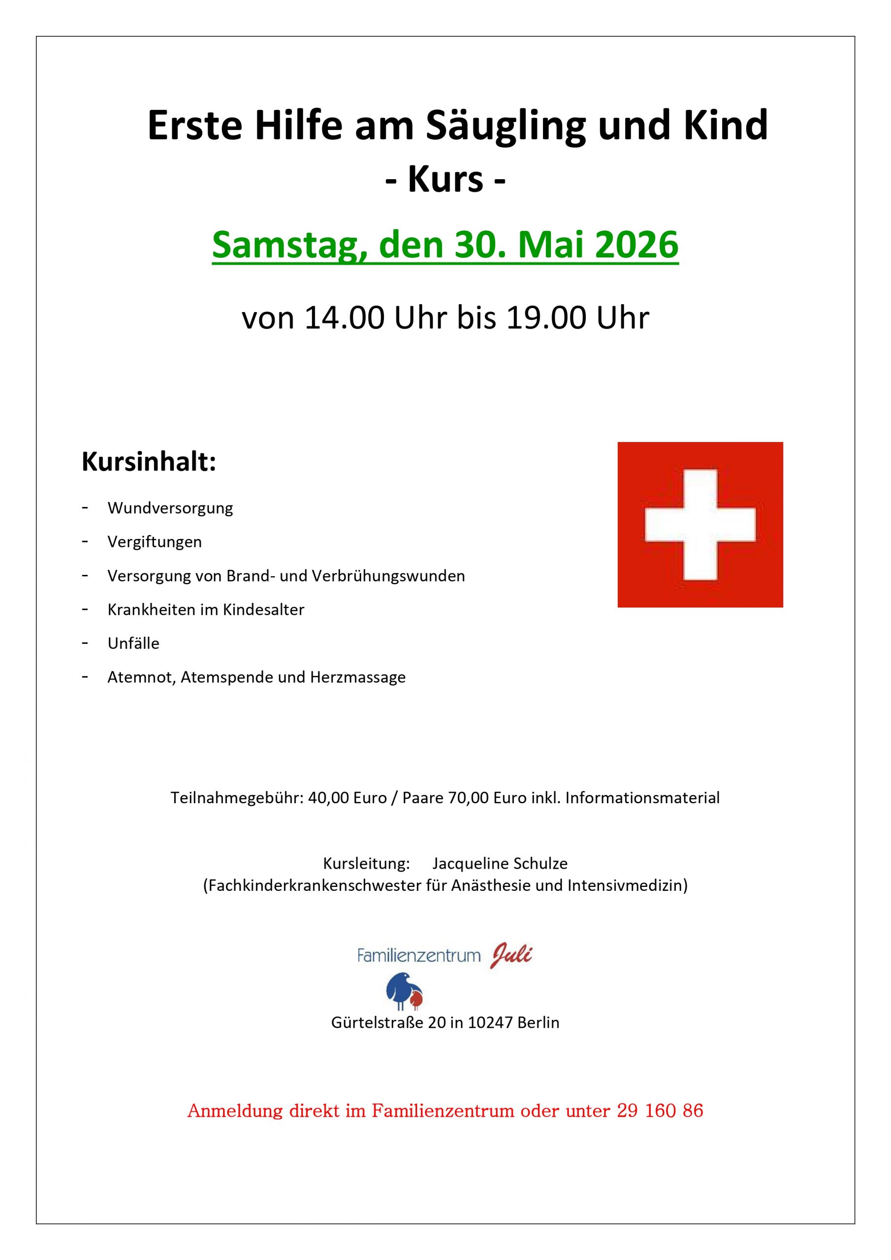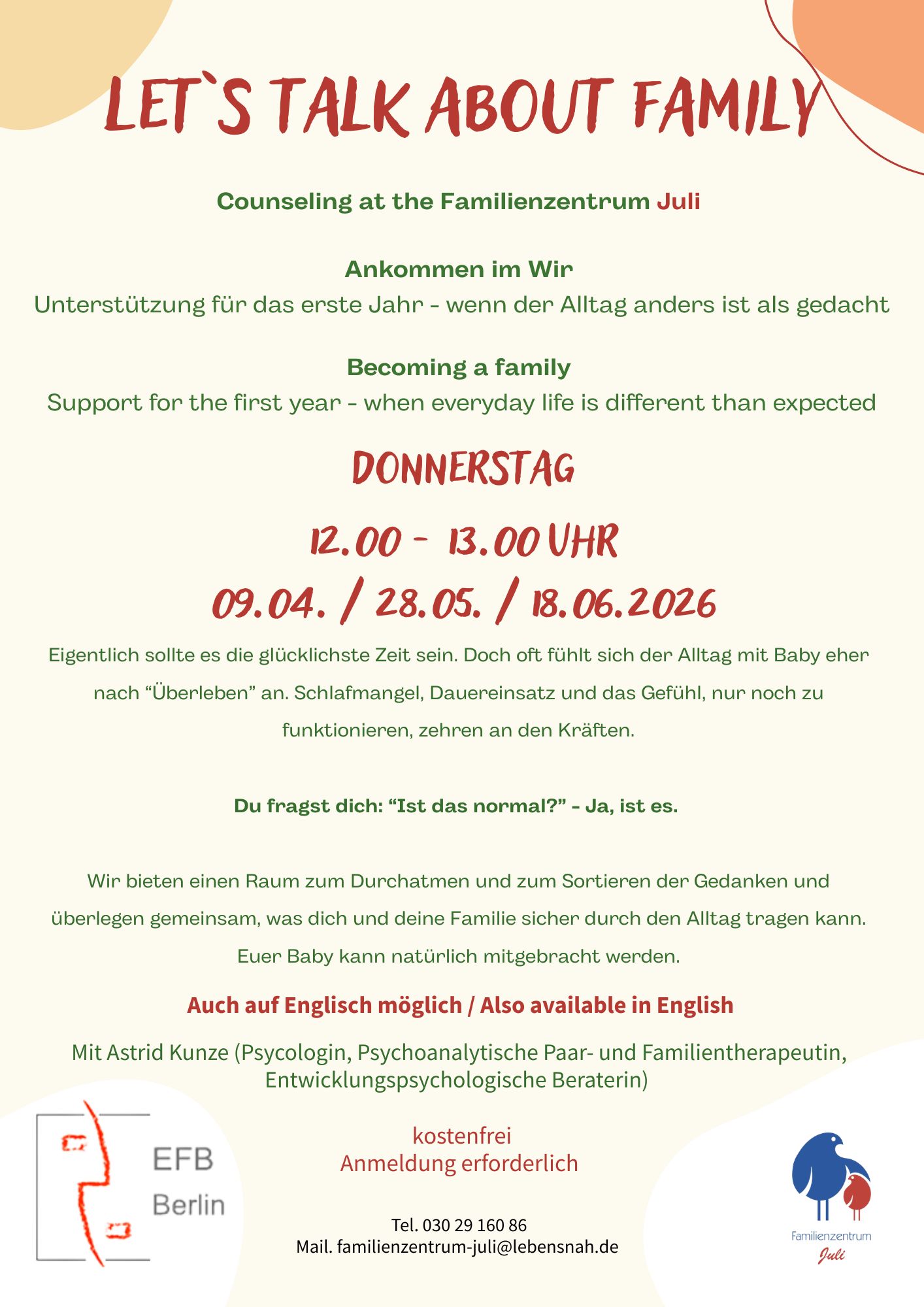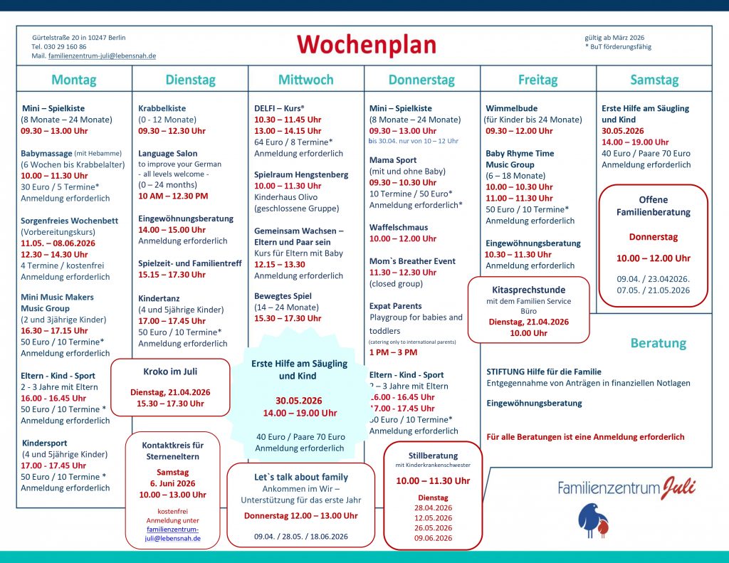 Telefon: 030 29 160 86 oder Mail: familienzentrum-juli@lebensnah.de